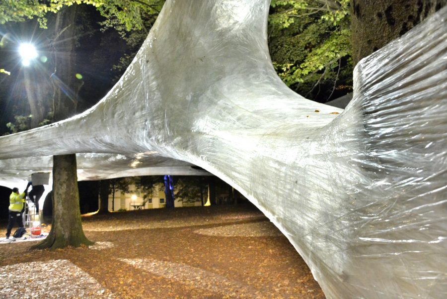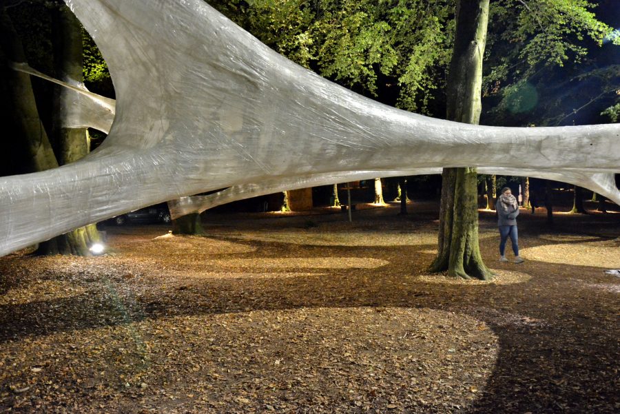 Von Weitem sieht es aus, als ob ein bizarr geformtes Raumschiff im Loher Wäldchen gelandet sei. Kommt man näher, erweckt das Gebilde den Eindruck eines riesigen Spinnennetzes. Gesponnen hat das Team von „Numen/For Use“ allerdings nicht. Es wurde getaped was das Zeug hält. Rund 30 Kilometer handelsübliches Klebeband haben die Frauen und Männer zwischen den alten Bäumen verspannt – geschätzte 1200 Rollen. Rund eine Woche nahmen sie dabei abenteuerliche Haltungen und hohen Leitern ein. Ein Knochenjob. Er hat sich gelohnt.
