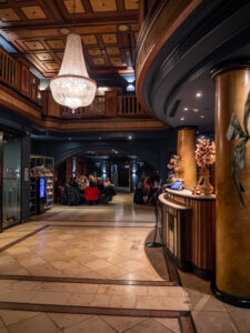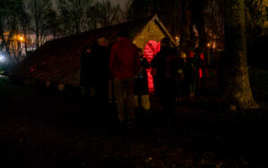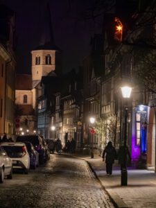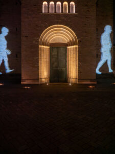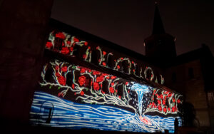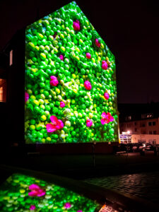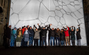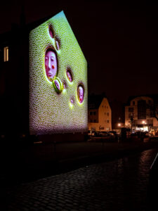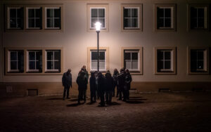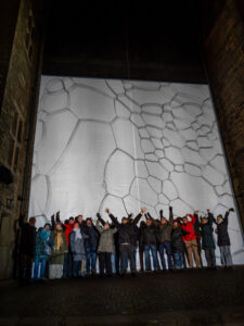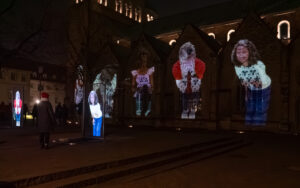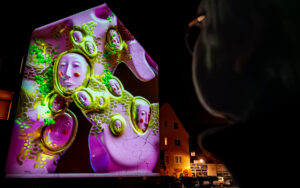 Am Hildesheimer Rathaus traf die Gruppe mit Ingo Wendt einen alten Bekannten. Der Lichtkünstler aus der Pfalz hatte bei den Lichtrouten 2018 das Publikum mit seiner Arbeit „Chronotop“ im Turmzimmer von St. Josef und Medardus begeistert. In Hildesheim projizierte er mit seinem „Seifenblasen-Projektor“ ständig wechselnde Seifenblasenmuster an die Außenfassade des Rathauses.