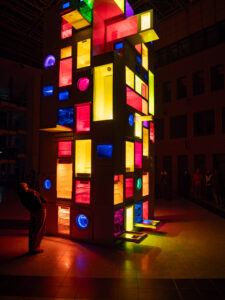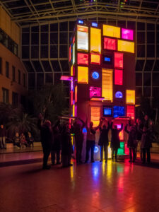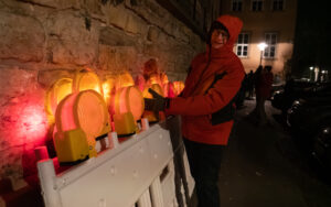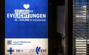 Erkundungstour bei frostigen Temperaturen: Mitglieder des Lichtroutenkollektiv haben das Festival EVILichtungen in Hildesheim besucht – und in der niedersächsischen Universitätsstadt gleich einen Favoriten für die Lichtrouten 2027 entdeckt. Die interdisziplinäre Lichtinstallation „Chor“ von Bahzad Sulaiman, die aus einer Sammlung entsorgter Haushaltsgeräte besteht, hätte gut zum nächsten Lüdenscheider Lichtfestival gepasst.Sie besteht aus ausrangierten Kühlschränken, Waschmaschinen, Geschirrspülern und Mikrowellen, die sich zu einer über sechs Meter hohen Skulptur auftürmen. Verschiedene Lichtquellen leuchten die Innenräume der Geräte aus, wobei sich ihre Lichtstimmung gegensätzlich zu ihrer Energie verhält. So leuchten Geräte, die in ihrer Funktion kalte Energie abgeben, in Licht mit warmem Farbton und Geräte, die warme Energie produzieren, in Licht mit kaltem Farbton. Dazu kommt eine Soundcollage aus den allzu vertrauten und alltäglichen Geräuschen der Maschinen. Aber: Zu früh gefreut. Leider tauchten zu viele Hindernisse auf. Der Chor der Haushaltsgeräte wird in Lüdenscheid nicht zu hören und zu sehen sein.