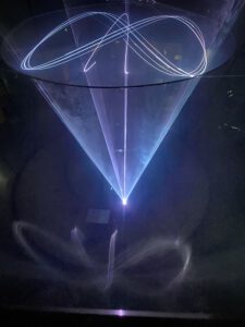 Eine virtuelle kinetische Skulptur erwachte mittels 3D-Brille zum Leben. Besucherinnen und Besucher konnten die Klänge und Bewegungen selbst modulieren.