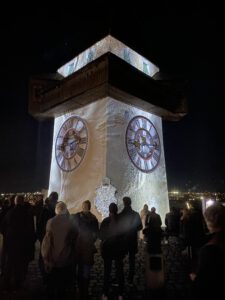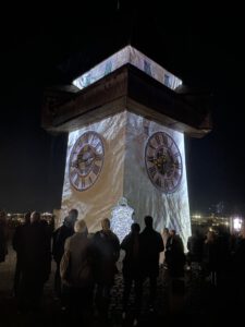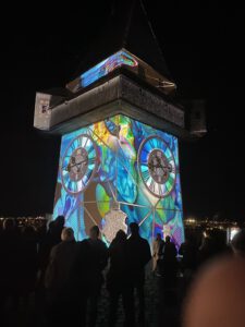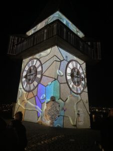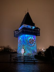 Eine Projektion auf das Grazer Wahrzeichen, bei der sich Licht und Klang zu einem flirrenden Spiel zwischen Realität und Illusion verbanden. Julian Hölscher war in Lüdenscheider mit einer Architektur-Projektion auf dem Phänomenta-Turm vertreten.