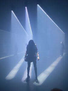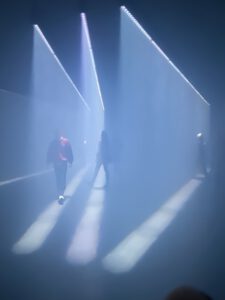Spiegel und Sensoren reagierten auf Bewegung und Emotionen des Publikums – ein Spiel mit Identität und Verbindung.