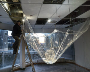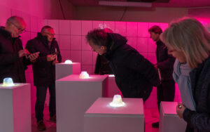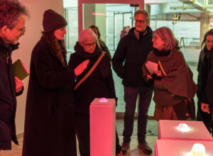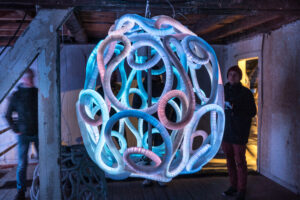 So überrascht Isabelle Kirsch mit ihrer Arbeit „Organismus“ im Gebäude der VHS (Altes Rathaus). Sie zeigt eine Installation aus mehreren artifiziellen Körpern im Raum. Lichtsequenzen pulsieren durch ein selbstleuchtendes Exoskelett, während zarte kinetische Kontraktionen die Körper zusammenziehen und sie lebendig wirken lassen. Die Objekte bewegen sich zwischen träumerischer Utopie und konfrontativer Dystopie – ein Spiel aus Lebendigkeit und Künstlichkeit.