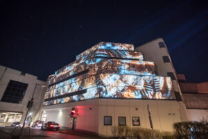 Für “Lux Arcana” von Felix Frank bildet die rückwärtige Fassade des Stern-Centers das Koordinatensystem für ein 3D Mapping. Architekturansichten, Raumvorstellungen und Materialverständnis werden verschoben zugunsten eines Narrativs von einem geheimnisvollen Lichts im Innern der architektonischen Hülle.